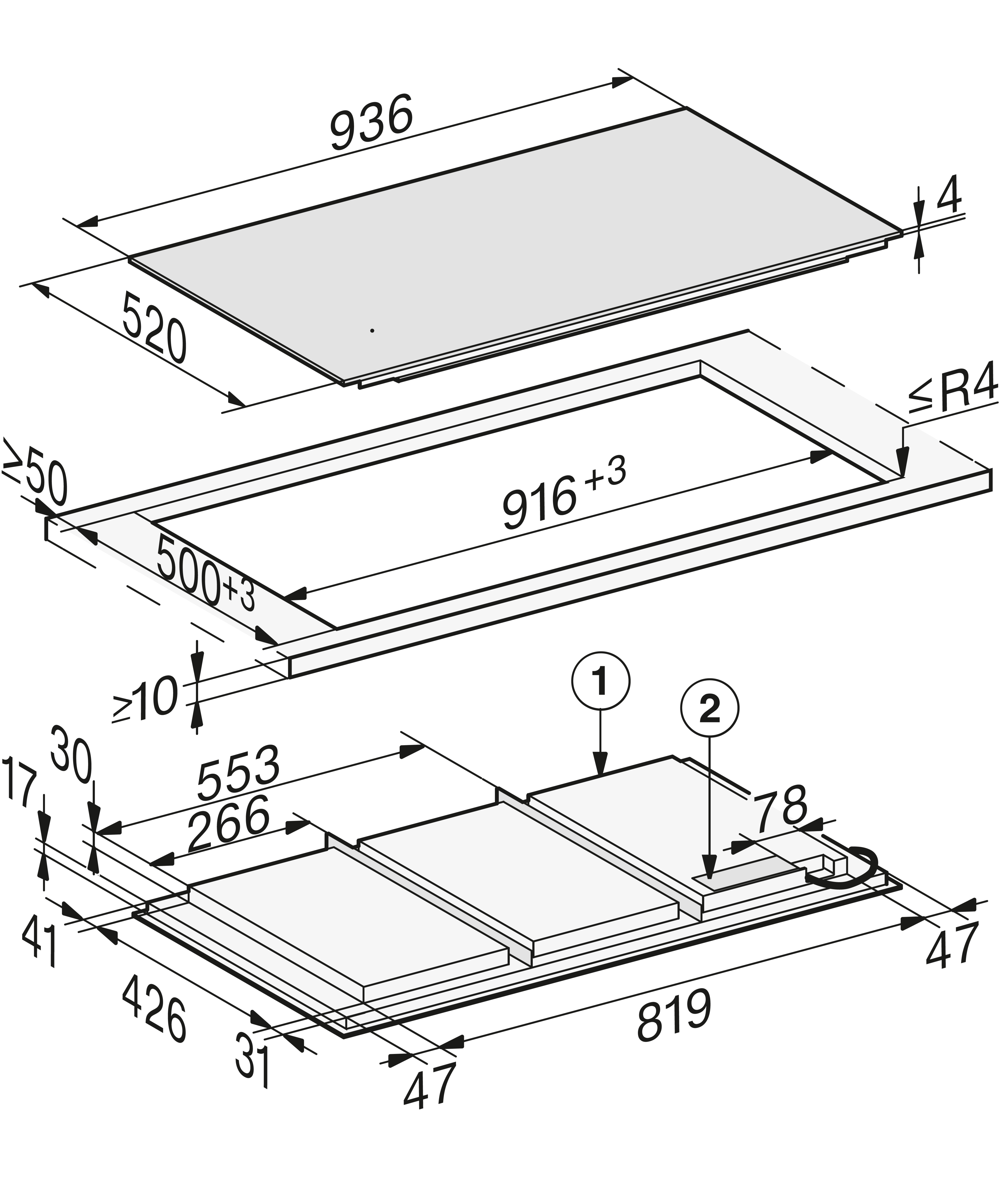 Внешние размеры выреза в мм (ширина) для встраивания заподлицо