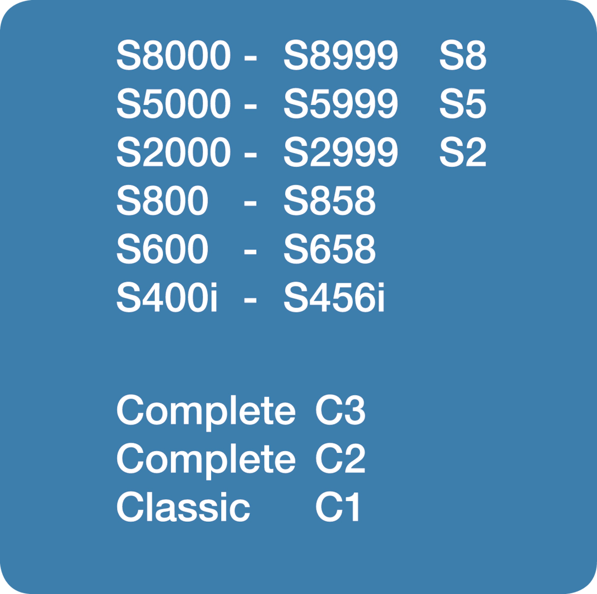 S8, S5, S2, S800-S858, S600-S658, S400i-S456i, Complete C3, Complete C2, Classic C1