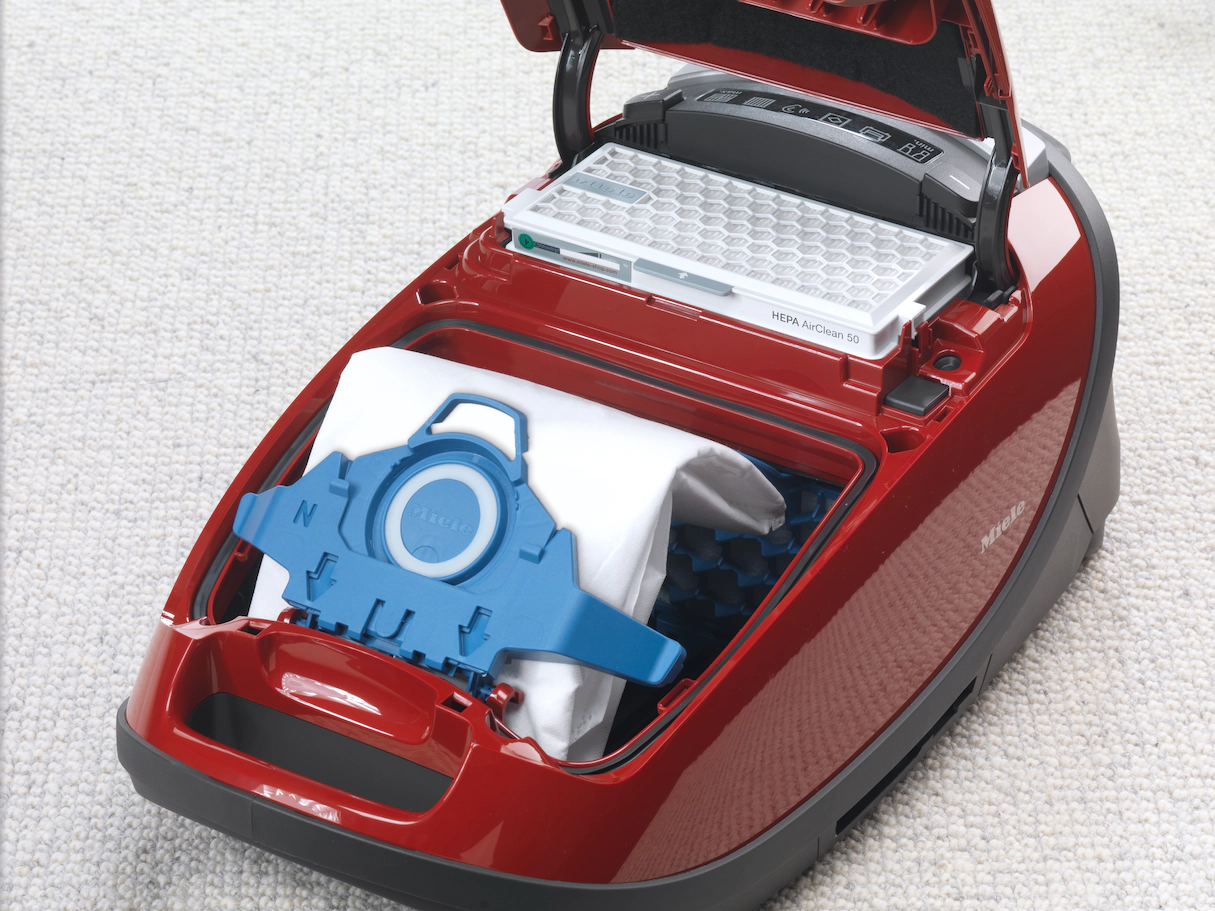 ~Теперь можно дышать легко.  Система фильтрации Miele AirClean, состоящая из оригинального мешка-пылесборника Miele, фильтра защиты двигателя и фильтра выходящего воздуха AirClean, обеспечивает максимальную степень гигиеничности. Количество мелкой пыли в воздухе помещения значительно уменьшается: взаимодействие компонентов системы обеспечивает фильтрацию более чем 99,9 % мелкой пыли. При использовании фильтра HEPA AirClean воздух на выходе из пылесоса даже чище, чем воздух помещения.